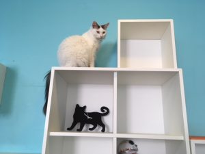 The welfare of the cats is of utmost priority at Catmosphere. A maximum of ten humans are allowed in the upstairs cat room and five in the kitten room below. The rooms feature numerous ledges, shelves, nooks, and hidey holes to which the cats can retreat when they want to sleep or cast a watchful eye over the visiting humans. There is also a separate rest area for the cats when required. The cafe closes from 3–4 pm each day to give all the cats a break. And the hours for the kitten room are reduced too.