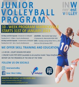 10-week Junior Volleyball Program. Starts with school term 1 in Marrickville High School.
