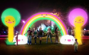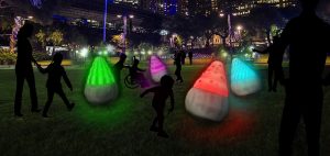 Harmony Valley – Rainbow of Peace & Trees of Friendship includes a series of large inflatable sculptures with exaggerated cute aesthetics referencing Japanese ‘kawaii’ culture. There is also a lively accompanying soundscape. Visitors are invited to interact with the sculpture by forming a chain to connect with each end of the rainbow. When this positive cooperative act takes place, the sculpture responds with new sounds, animations and pulsing light.