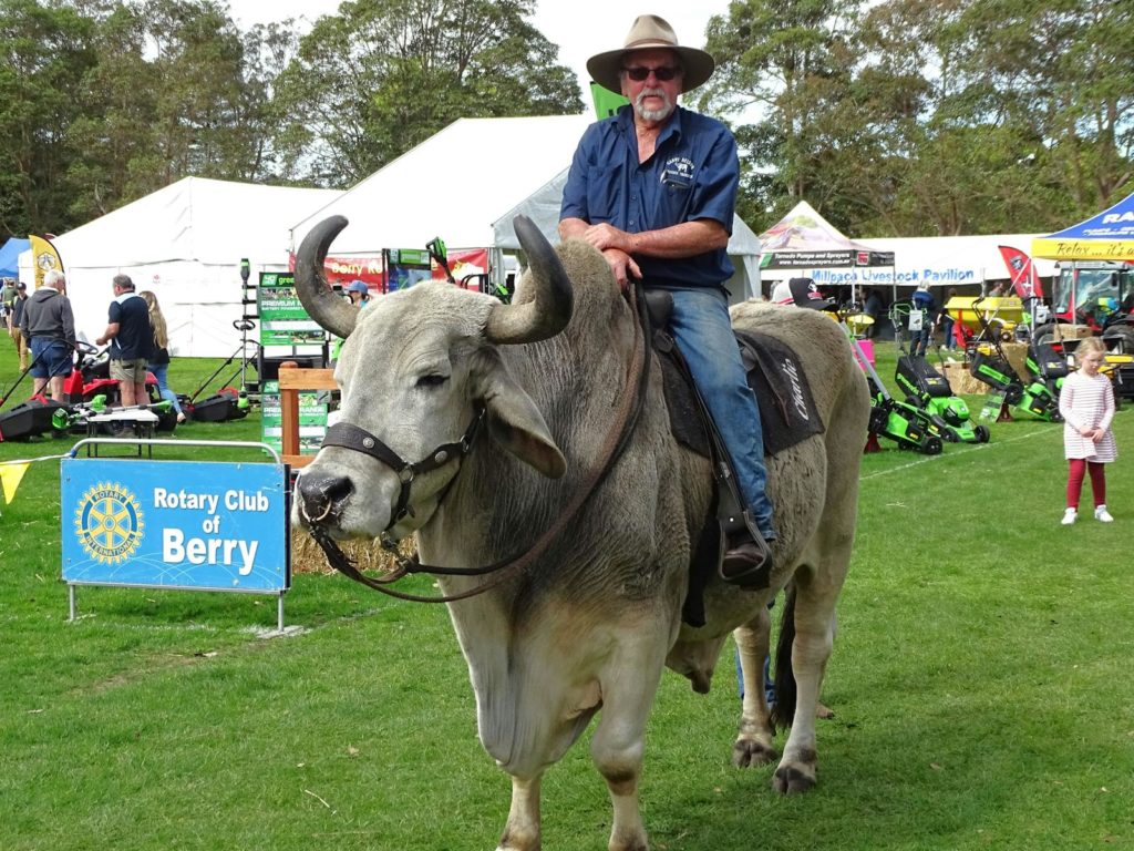 Man riding a horned cow. Image courtesy of Shoalhaven Tourism.